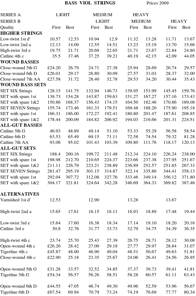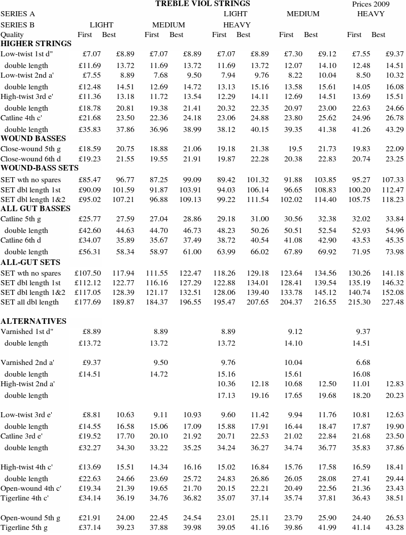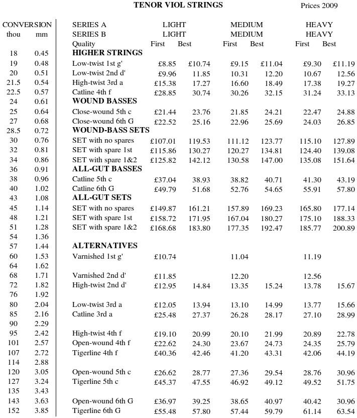 The two columns above and on the left are a conversion table of string diameters or equivalent diameters (ED's) from thou to mm. Strings wound with silver-plated copper and just copper cost the same, and are in the 'First' columns. Solid silver windings are in the 'Best' columns. Surcharges for catline polishing are £5.95 for treble (£11.90 for a double length), £7.70 for tenor and £9.80 for bass viol.