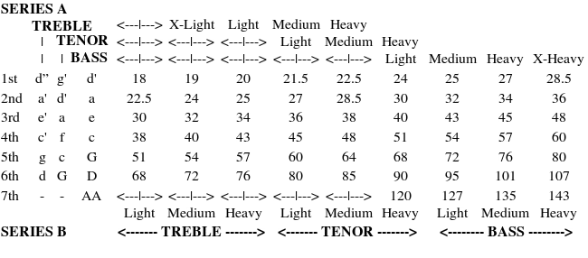 The numbers in the following Table are the string diameters or equivalent diameters (ED's) of catline or wound strings, expressed in 'thou' (thousandths of an inch).