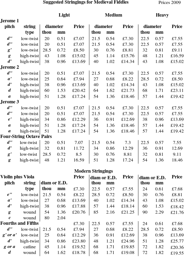 That Table also includes two popular modern stringings for medieval fiddles. The string tensions vary in the modern violin tradition, with the tension decreasing with lower pitch to provide quicker response in the bass and to suppress the boom of thicker metal-wound bass strings. The violin plus viola tuning assumes that the string length is 32 cm. The fourths and fifths tuning assumes a string length of 36 cm. It is possible to have all-gut stringing for these tunings by substituting catline strings (which are more expensive) for the metal-wound ones.
